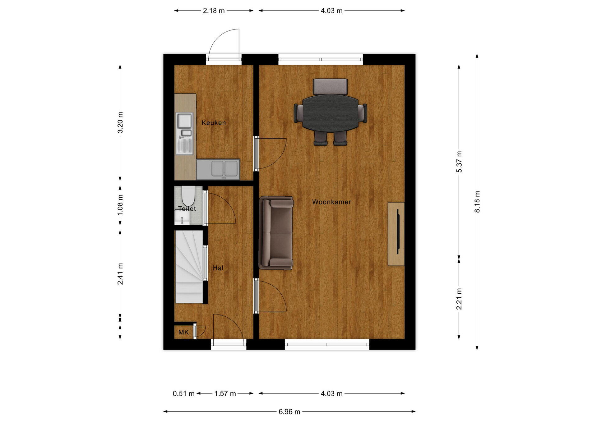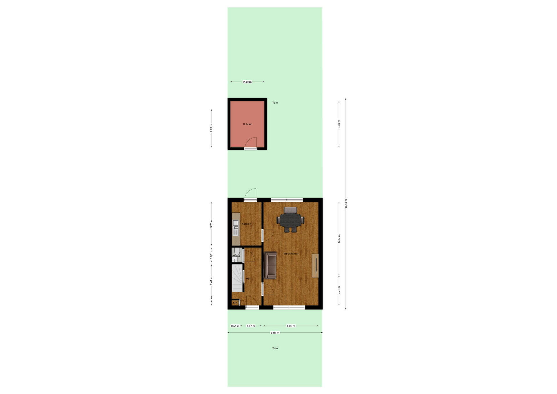- 97 m² (14 meter diep en 6.96 meter breed)