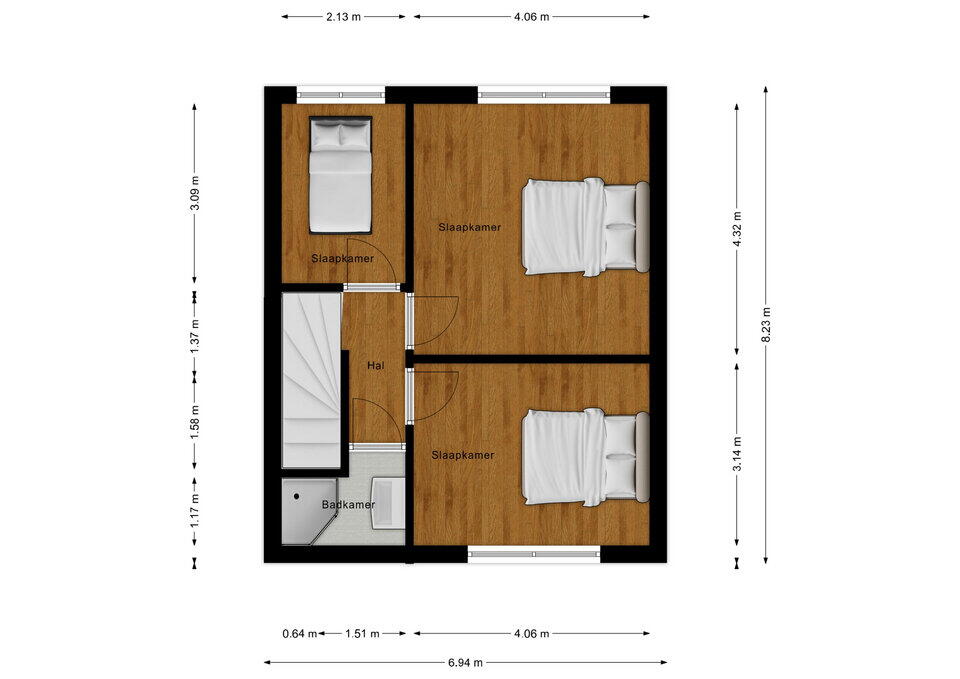 De overloop geeft toegang tot drie slaapkamers en de badkamer. Aan de voorzijde bevindt zich een slaapkamer van circa 13 m². Aan de achterzijde zijn twee slaapkamers gesitueerd van respectievelijk circa 18 m² en 7 m². De grootste slaapkamer biedt ruimschoots plaats voor een tweepersoonsbed en kastruimte. De derde kamer is uitstekend te gebruiken als kinder-, werk- of hobbykamer. De badkamer is ook in 2020 vernieuwd heeft een oppervlakte van circa 3 m² en is functioneel ingericht met een inloopdouche en wastafel.
